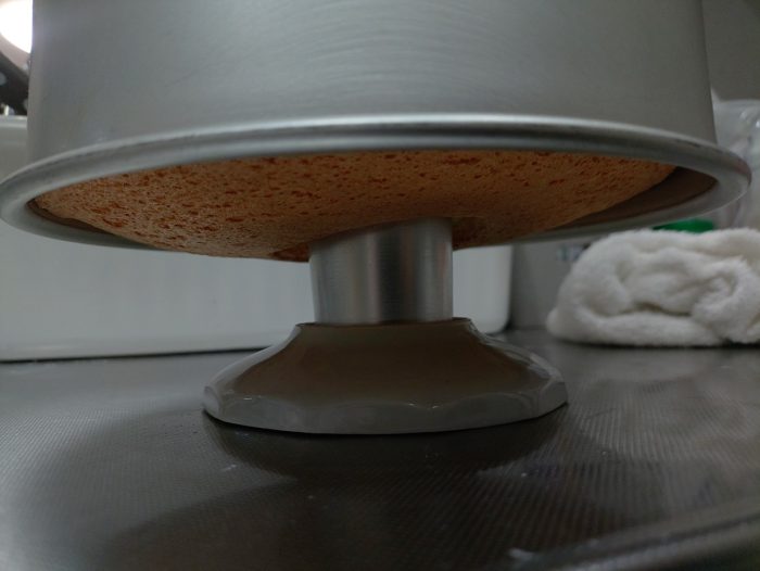 オーブンから出したら、決して台に叩きつけたりせず、すぐに瓶などに刺してひっくり返して冷ましましょう。 しっかり冷めたら、パレットナイフやヘラを使って型から外し、好きな大きさに切って召し上がれ!